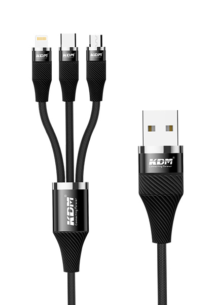 Meet the KDM-K4 3-in-1 USB cable: 18W output, 1200mm length, and unmatched durability with 1000+ bend tests. Featuring Type-C, Micro, and Lightning connectors in a sleek black design, it ensures fast charging and data sync. Proudly made in India for seamless multitasking.